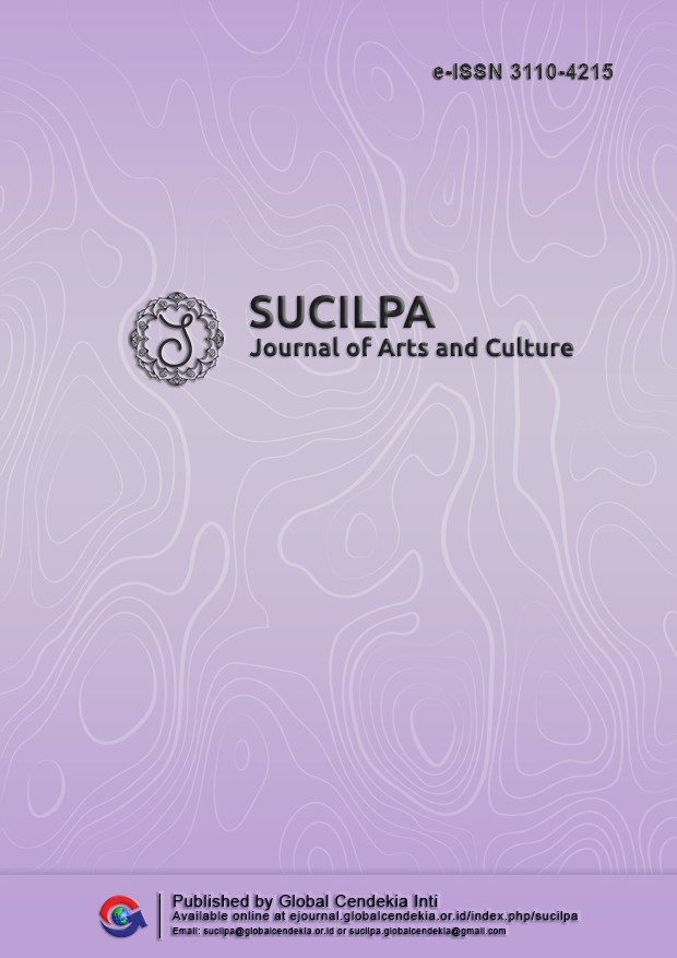 Each issue of Journal of Arts and Culture: Sucilpa presents a curated collection of scholarly works that reflect the journal’s commitment to advancing research and critical dialogue in the fields of arts and culture. Covering a broad spectrum of themes, from theoretical and historical studies to contemporary practices and interdisciplinary explorations. Every issue highlights the dynamic relationship between artistic expression, cultural identity, and societal development. By accommodating diverse perspectives, methodologies, and cultural contexts, SUCILPA seeks to foster intellectual rigor, aesthetic appreciation, and cultural significance, ensuring that each publication serves as both a repository of knowledge and a catalyst for ongoing scholarly discourse in arts and cultural studies.